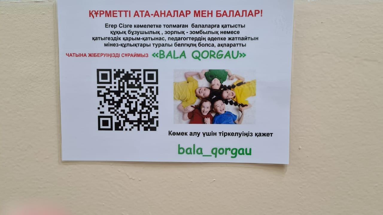 Егер Сізге кәмелетке толмаған балаларға қатысты құқық бұзушылық, зорлық-зомбылық немесе қатыгездік қарымөқатынас, педагогтердің әдепке жатпайтын мінез-құлықтары туралы белгіңіз болса, ақпаратты "Bala Qorgau" чатына жіберуіңізді сұраймыз.