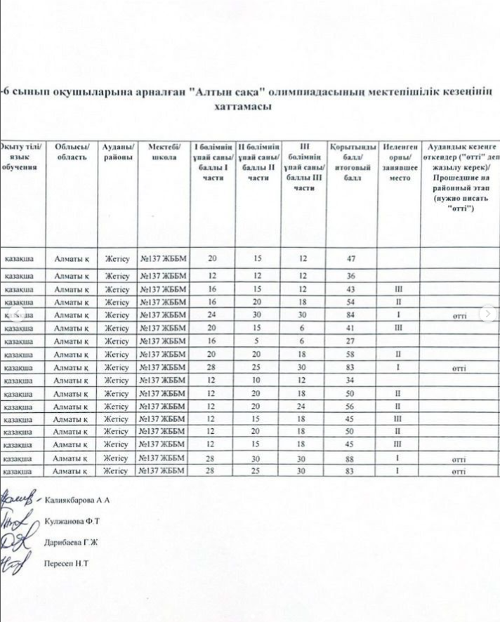01.10.2024ж күні “М.Жұмабаев атындағы №137 жалпы білім беретін мектеп” коммуналдық мемлекеттік мекемесінде 5-6 сыныптарға арналған Республикалық “Алтын сақа” математикалық олимпиадасының мектепішілік кезең өтті. Мектепішілік кезеңге 5 сыныптардаң 13