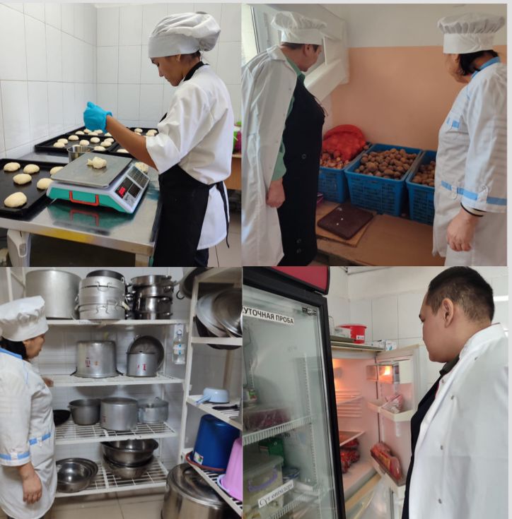 Мектеп директорының тәрбие ісі жөніндегі орынбасары Өміралы Нұрбол Ерболұлы, медбике Бурлибаева Раушан, әлеуметтік педагог Мухаметкалиева Жанель Нұрланқызы асхананың санитарлық-гигиеналық жағдайын, тағамдардың сақтау мерзімінің дұрыс болуын және жалпы асхананың жұмысын бақылау мақсатында мектеп асханасын тексеріп, бақылауда.