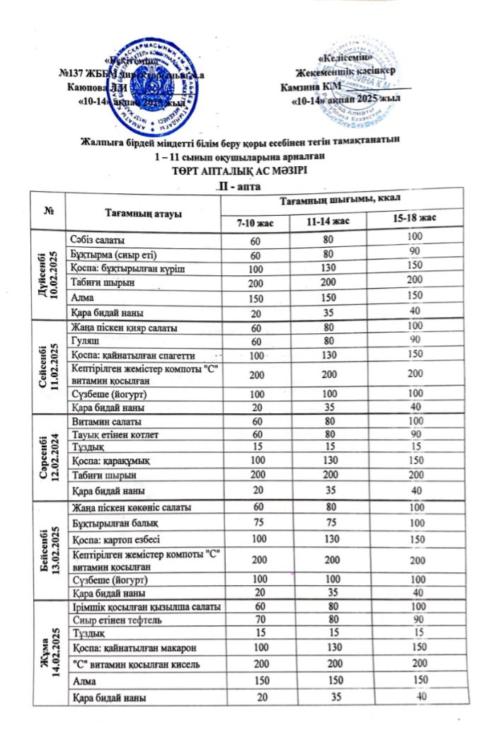 10 ақпан 2025 0 1 2 3 4 5 2025 жылғы 10-14 ақпан аралығындағы ас мәзірі. Осы беттің QR-коды:QR-код этой страницы: