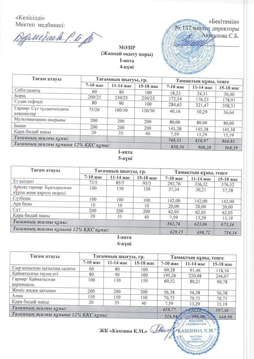 Тағамның жалпы құнына 12% ҚҚС құны: | 838,36 | 908,28 | 968,59 | |||